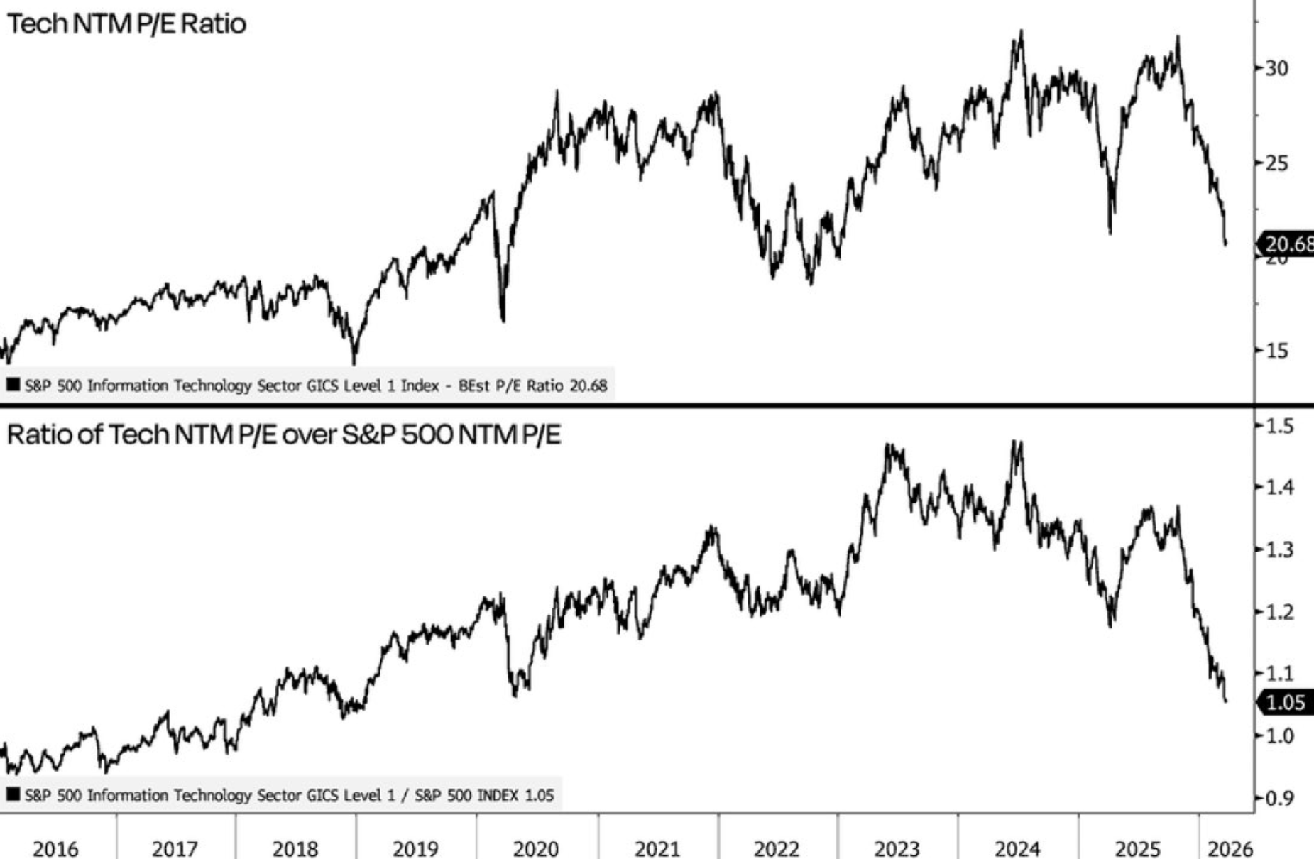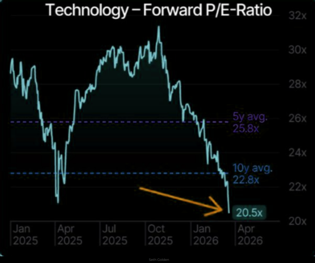5-årsnittet för värdering på Tech ligger på framåtblickande P/E 25,8x, medan 10-årsnittet noteras på 22,8x. Dagens 20,5x är betydligt under de historiska snitten och även lägre än april-kraschen 2025!
