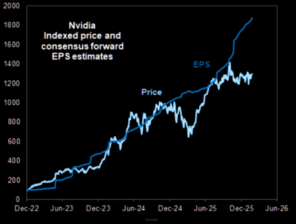 Vi ska i kvällens inlägg ta temperaturen på “AI-bolagen” och se om en AI-bubbla verkligen är ett hot här och nu. Låt oss börja med Nvidia som ändå är den stora “poster boyen” för hela AI-racet. Aktien noteras idag på samma kurs som i mitten av juli medan marknadens förväntningar på vinst per aktie (EPS) stigit markant under samma tid. Således är Nvidia betydligt billigare idag än i somras och man kan summera det som att aktien växt in i sin värdering. Om EPS-estimaten visar sig vara korrekta bör aktien stå inför en förnyad uppgång. Åtminstone med en vy på 12-18 månader!