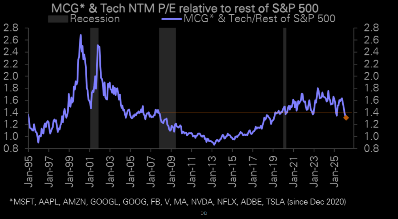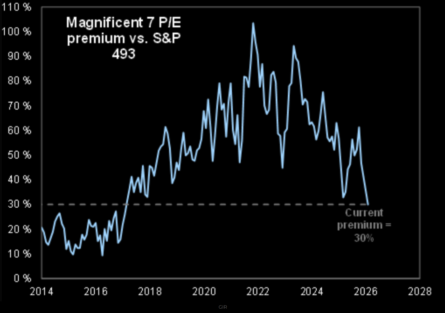 Magnificent Seven handlas nu till 30 % premium mot S&P 493 (det vill säga 500-7). Det är den lägsta premien för dessa bolag mot resterande S&P 500 sedan 2017!