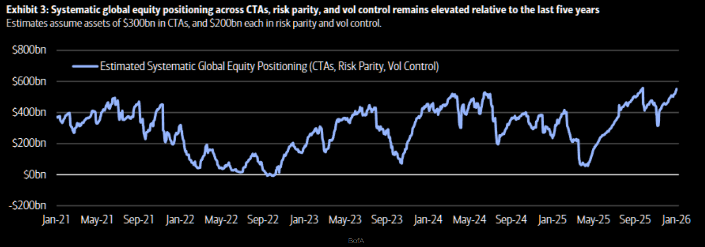 Systematiska strategier har varit fullt upptagna med att köpa global aktierisk sedan i våras. Nu har de återigen nått nivåer som utgjort “taket” de senaste fem åren.