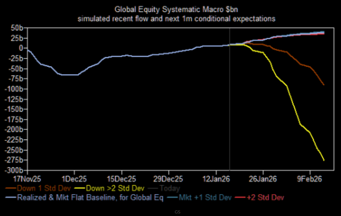 Den ökade aktievikten gör såklart även att det stora “deltat” ligger på nedsidan i form av flöden om nedgångarna på börserna skulle fortsätta kommande veckor. Estimerade flöden kommande månaden, enligt Goldman Sachs nedan.