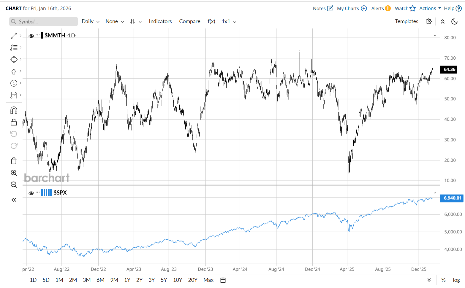 I takt med den bredare uppgången, snarare än endast AI-bolag, har också bredden i marknaden förbättrats avsevärt. Hela 64% av aktierna på NYSE handlas nu över MA200, vilket vi inte sett sedan hösten 2024. Större börsnedgångar brukar föregås av en längre tid med fallande bredd i marknaden. Där är vi alltså inte ännu!