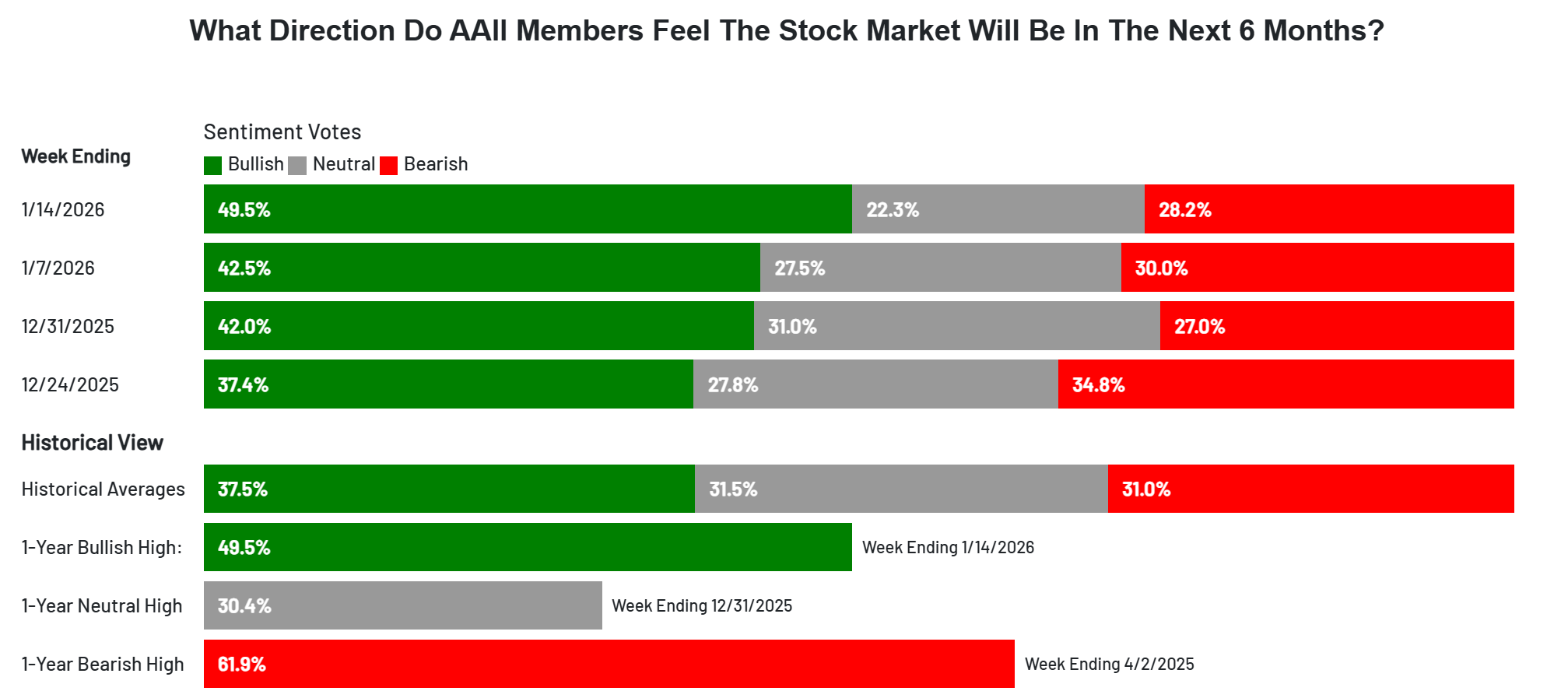 Uppgångarna har även bidragit till att sentimentet nu är betydligt mer positivt än tidigare. AAII Sentiment Survey visade på hela 49,5% Bulls förra veckan, den högsta noteringen sedan hösten 2024 (!). Avkylning igen – tack!