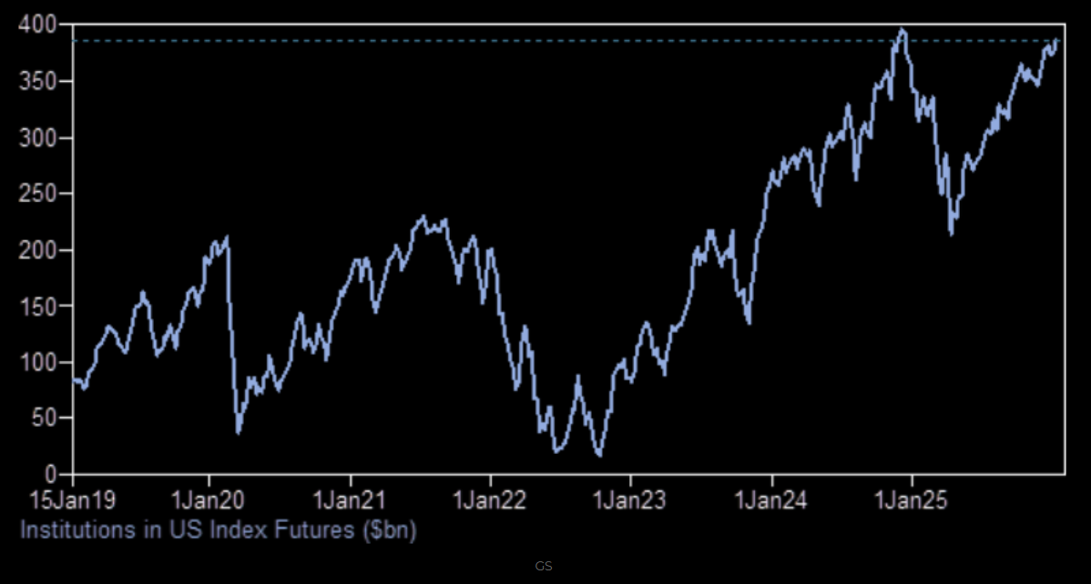 Goldman Sachs pekar på att institutionella pengar flödat in i amerikanska indexterminer under 2025 och noteras nu återigen när toppen från 2024. Viss avkylning även här vore på sin plats.