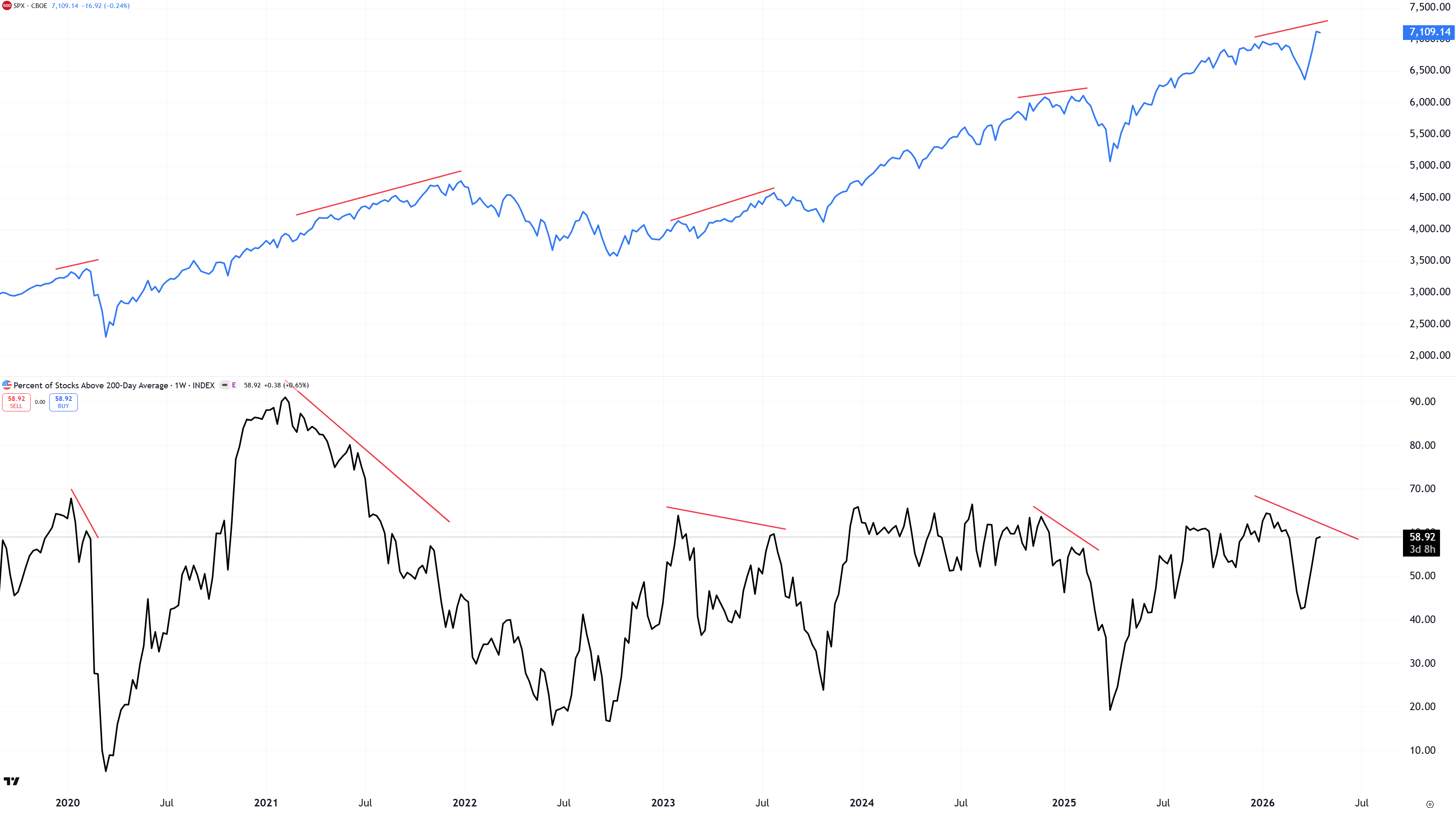 Ser vi till bredden generellt i uppgången är det nu en tydlig negativ divergens jämfört med S&P 500. Endast 59 % av aktierna noteras över sitt 200-dagars glidande medelvärde samtidigt som index noteras på nytt ATH. Vid toppen i mitten av januari var motsvarande siffra 64,5 %. Bredden måste komma tillbaka med kraft för att de senaste veckornas uppgång ska vara ihållig i flera månader till.
