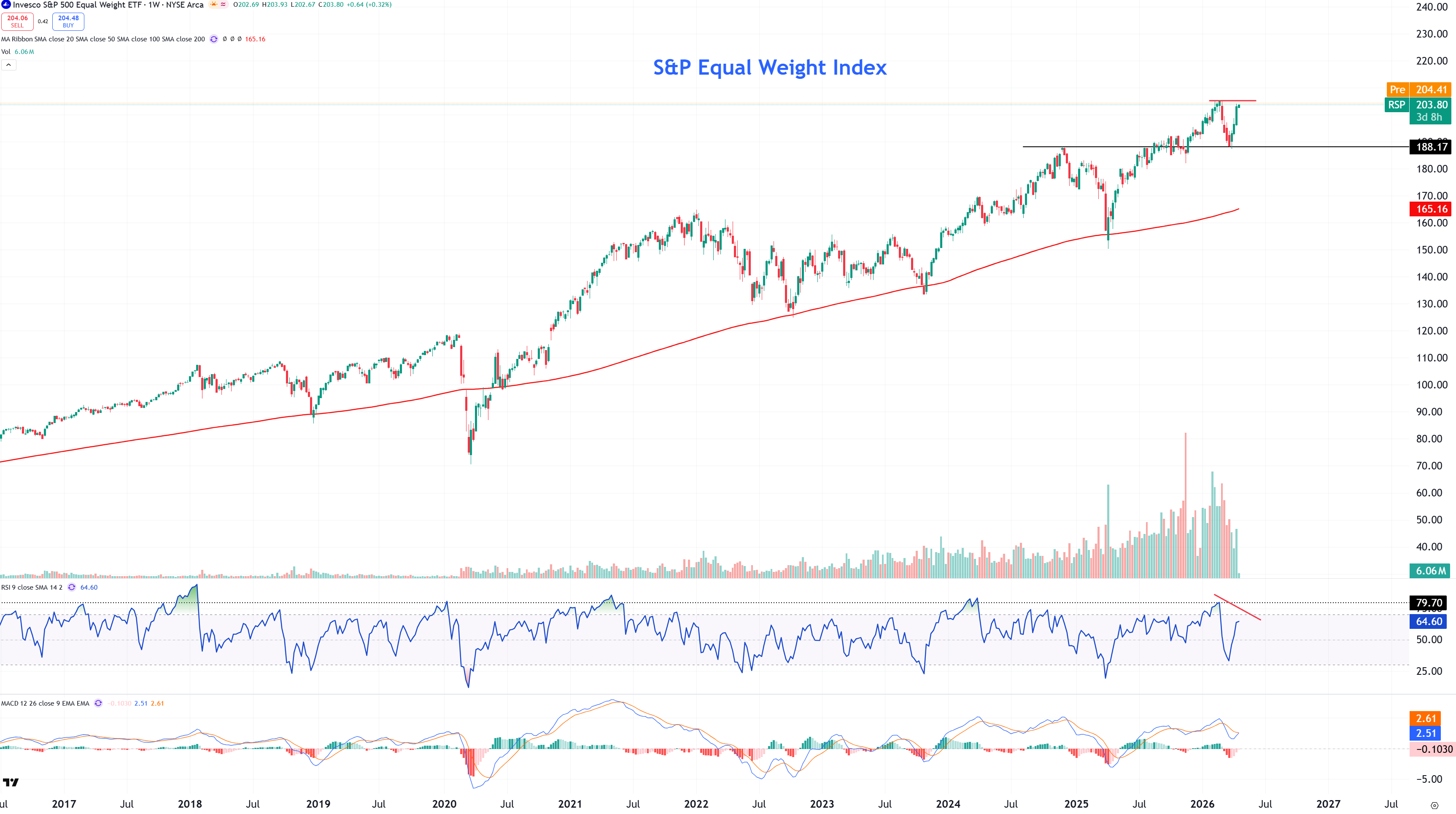 Att bredden haltar ser vi även i att ett likaviktat S&P 500 (RSP ETF) handlas under sin tidigare rekordnivå. Det tränade ögat ser även den markanta negativa divergensen i veckodiagrammet som är under uppbyggnad. Kommande 2-3 veckor måste bjuda på en förnyad mycket impulsiv uppgång för att denna ska neutraliseras.