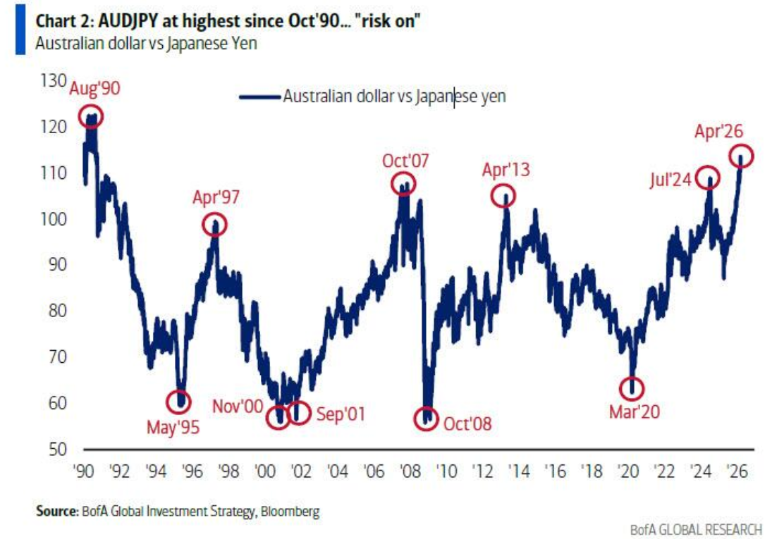 Att det råder ordentlig risk-on syns också i nedan graf över AUDJPY som noteras på den högsta nivån sedan 1990! Den australiska dollarn är en cykliska valuta, medan den japanska yenen ses som en “funding FX” globalt. Låna i Yen för att köpa cyklisk exponering.