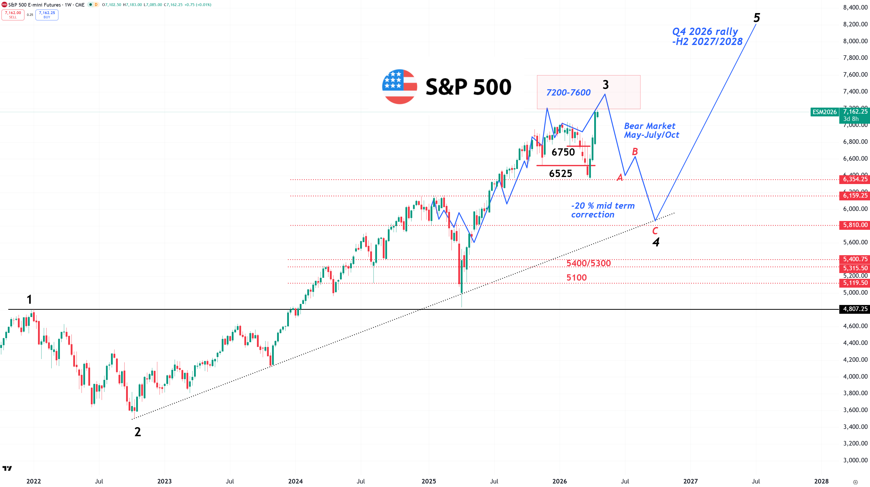 Jag personligen tror att fortsättningen på detta börsår blir betydligt mer utmanande och volatilt än vad indexen ger sken av just idag. Nedan graf visade jag i Börsmorgon den 3de mars. Mars som helhet blev sedan betydligt svagare än jag räknade med, men de senaste veckorna har börserna kommit igen med råge och vi går nu raskt in i den topp jag såg framför mig träffas i spannet 7200-7600 i mitten av maj.