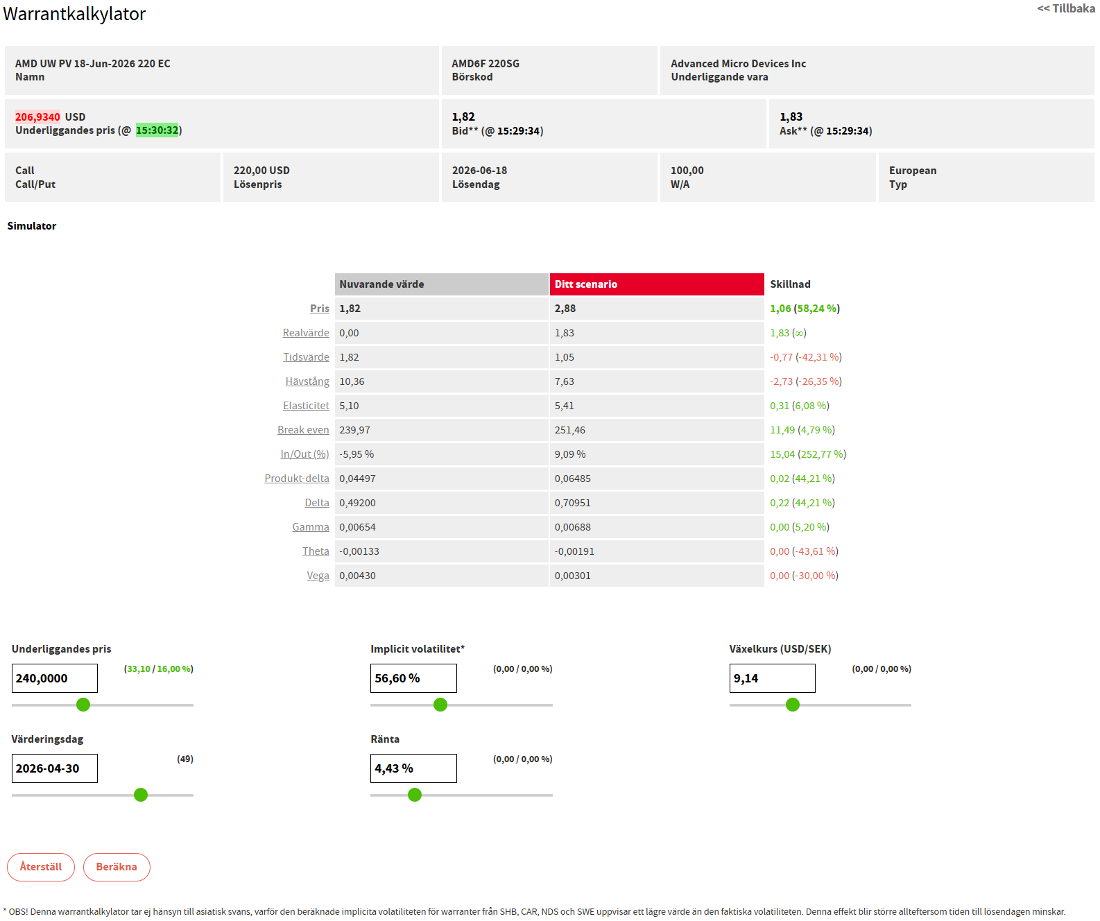 Vi tar som vanligt hjälp av Warrantkalkylatorn där produktens börskod kopieras in, dvs AMD6F 220SG. I denna kan vi enkelt estimera olika utfall och scenarion. Här ändrar jag “lösenpris” till 240 usd och “lösendag” till 2026-04-30. Notera att AMD handlas med en implicit volatilitet på 56,6 %, vilket gör derivat på AMD dyrare jämfört med aktier med låg volatilitet.
