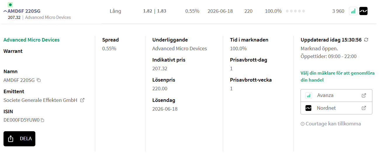 I ett sådant scenario kan köpwarranter med lösendatum i juni vara intressant och något som man sedan kan ta hem vinst på i slutet av april, eller rida kvar in i maj och mot lösen om man ser en potentiell fortsatt stark uppgång i korten. Här fastnar jag främst för AMD6F 220SG, som är en köpwarrant med AMD som underliggande aktie med lösenpris 220 USD den 18 juni i år.
