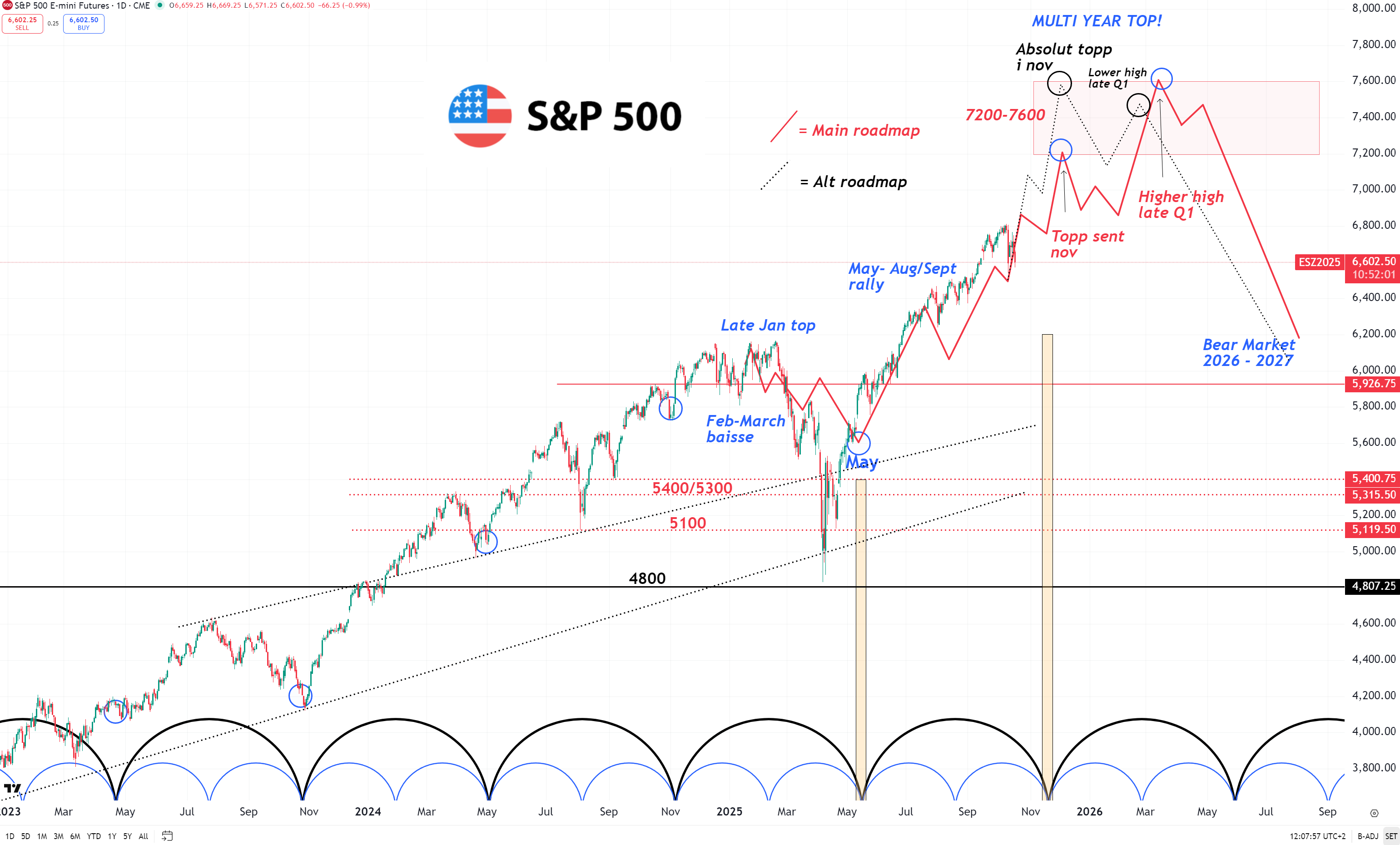 Jag har inte slängt ut nedan karta från den 25 september genom kontorsfönstret och möjligtvis är det just denna “urblåsning” som behövdes för att ta S&P 500 mot 7600. Mer troligt i Q1 snarare än i november som den alternativa färdvägen indikerar i grafen nedan.