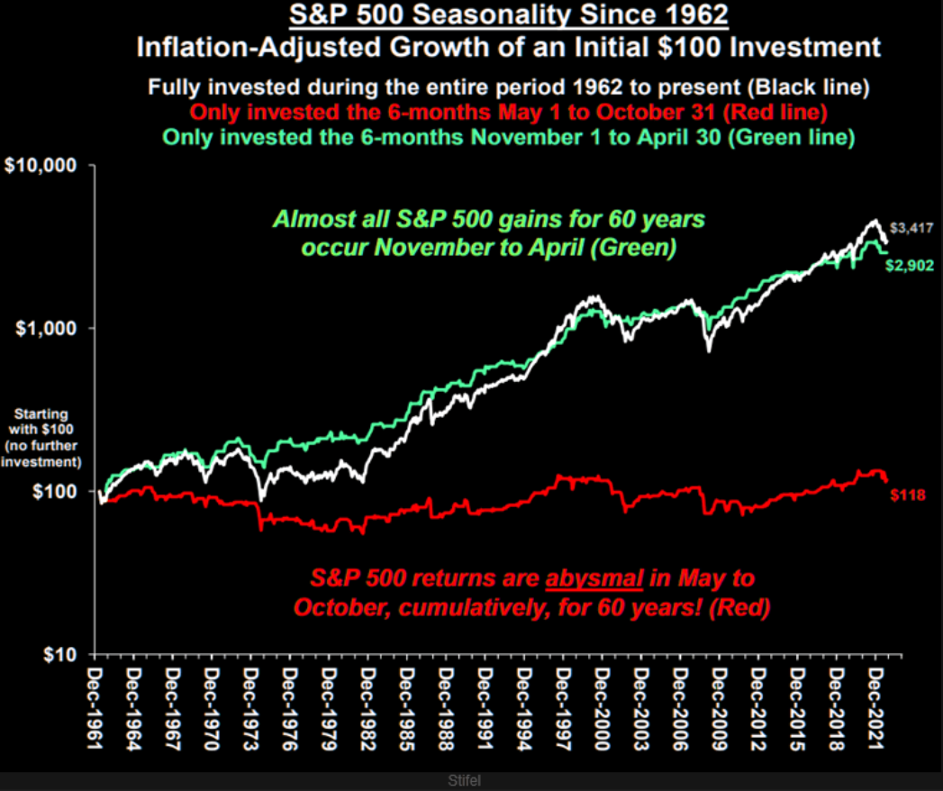 Grafen nedan visar på om man ägt S&P 500 under perioden november – april varje år. Från 1962 fram till 2022 skulle denna strategi ha gett +2900% i avkastning. Om man istället ägt S&P 500 enbart under perioden maj-oktober skulle det ha gett totalt +18% på 60 år (!). Grafen är hämtad från artikeln Vinnande strategi för soffliggaren, från den 1a oktober 2022.