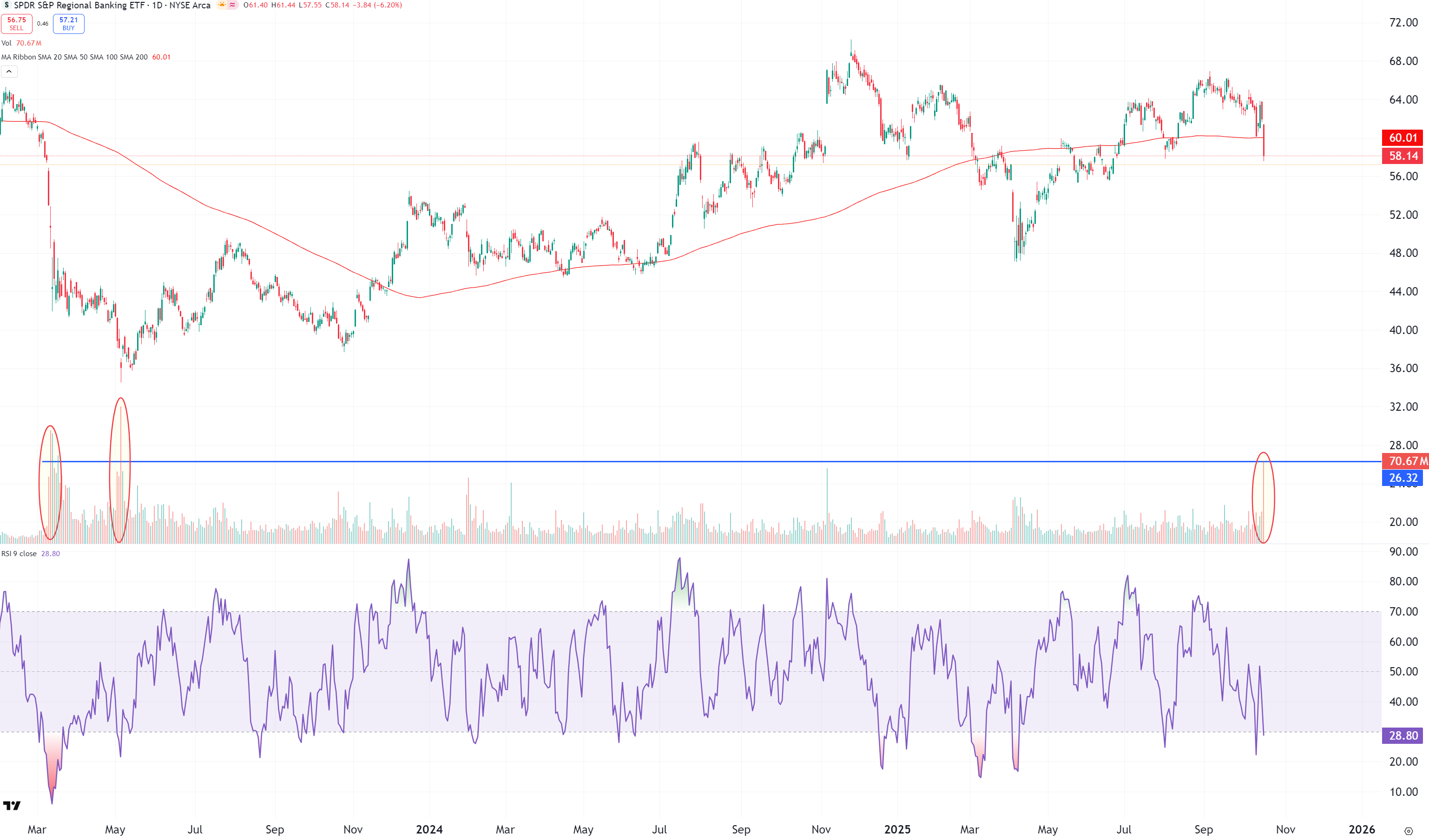 ETF:en SPDR S&P Regional Banking ETF såg den största handelsvolymen igår sedan bankkrisen i mars-maj 2023. Bevaka regionala banker noga här ifrån!