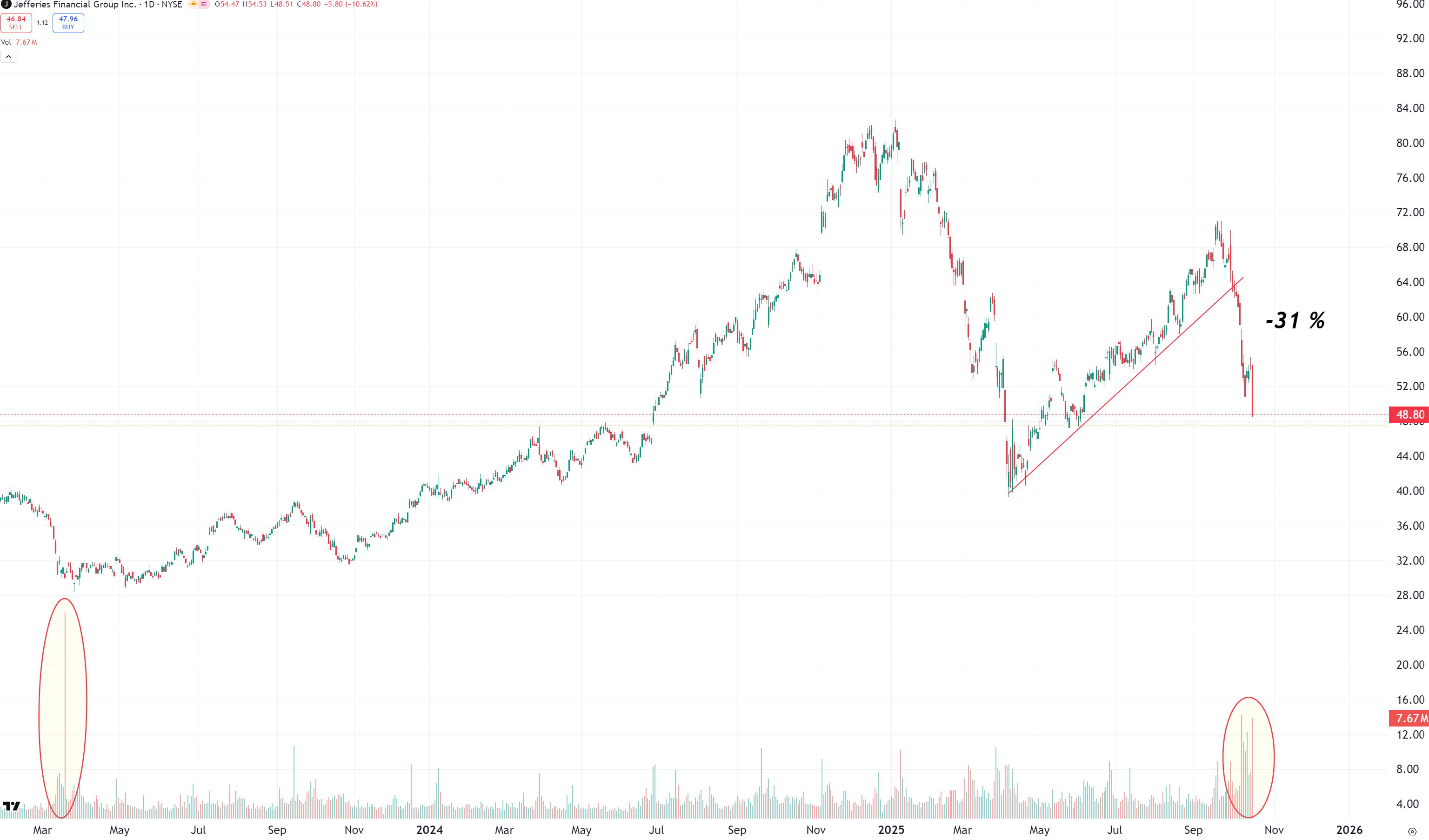 Bland enskilda aktier är exempelvis Jefferies ner -31% från den senaste toppen den 19 september.