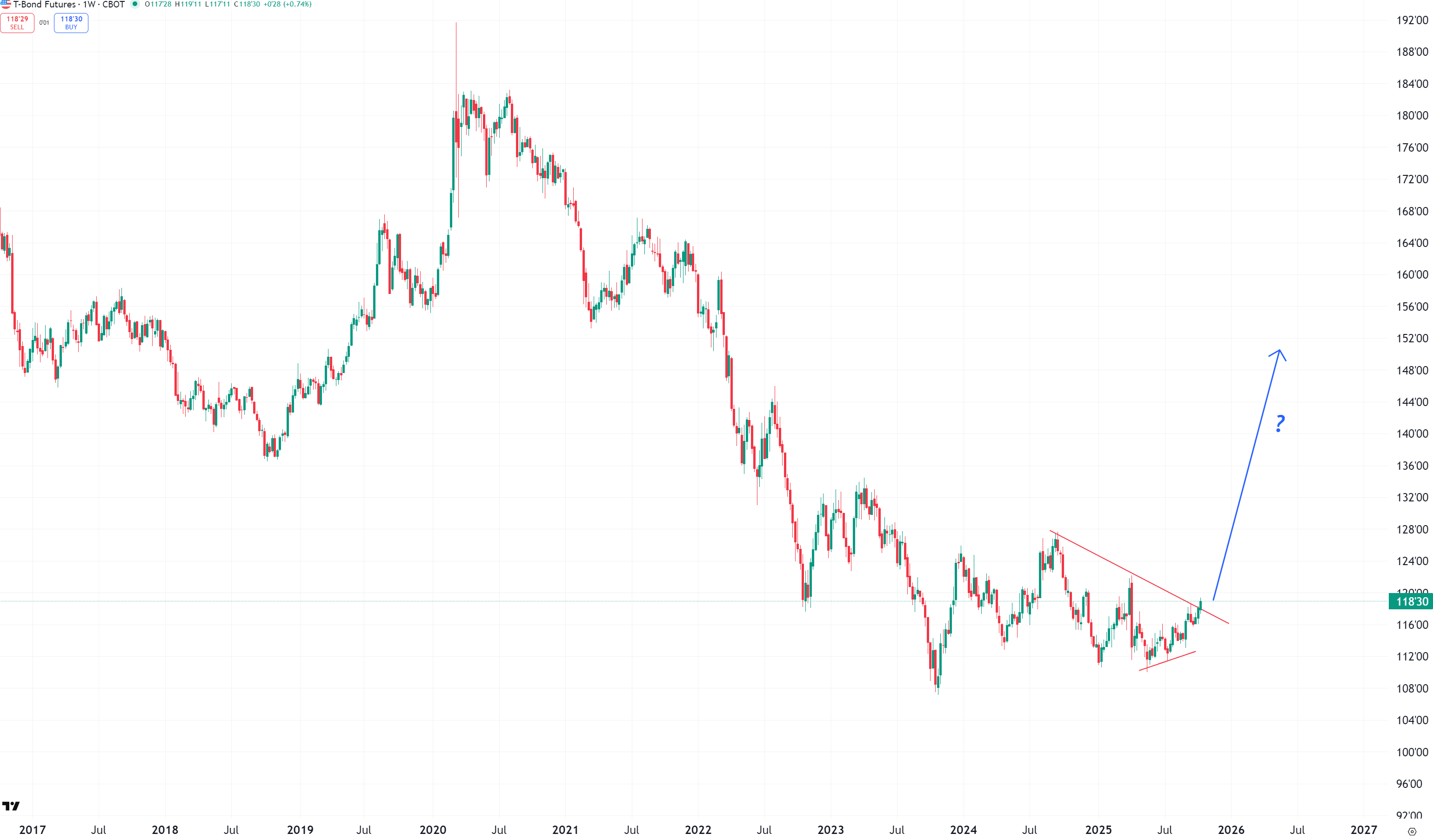 Treasury Bond Future i veckoperspektiv. Högre pris i obligationen = lägre ränta.