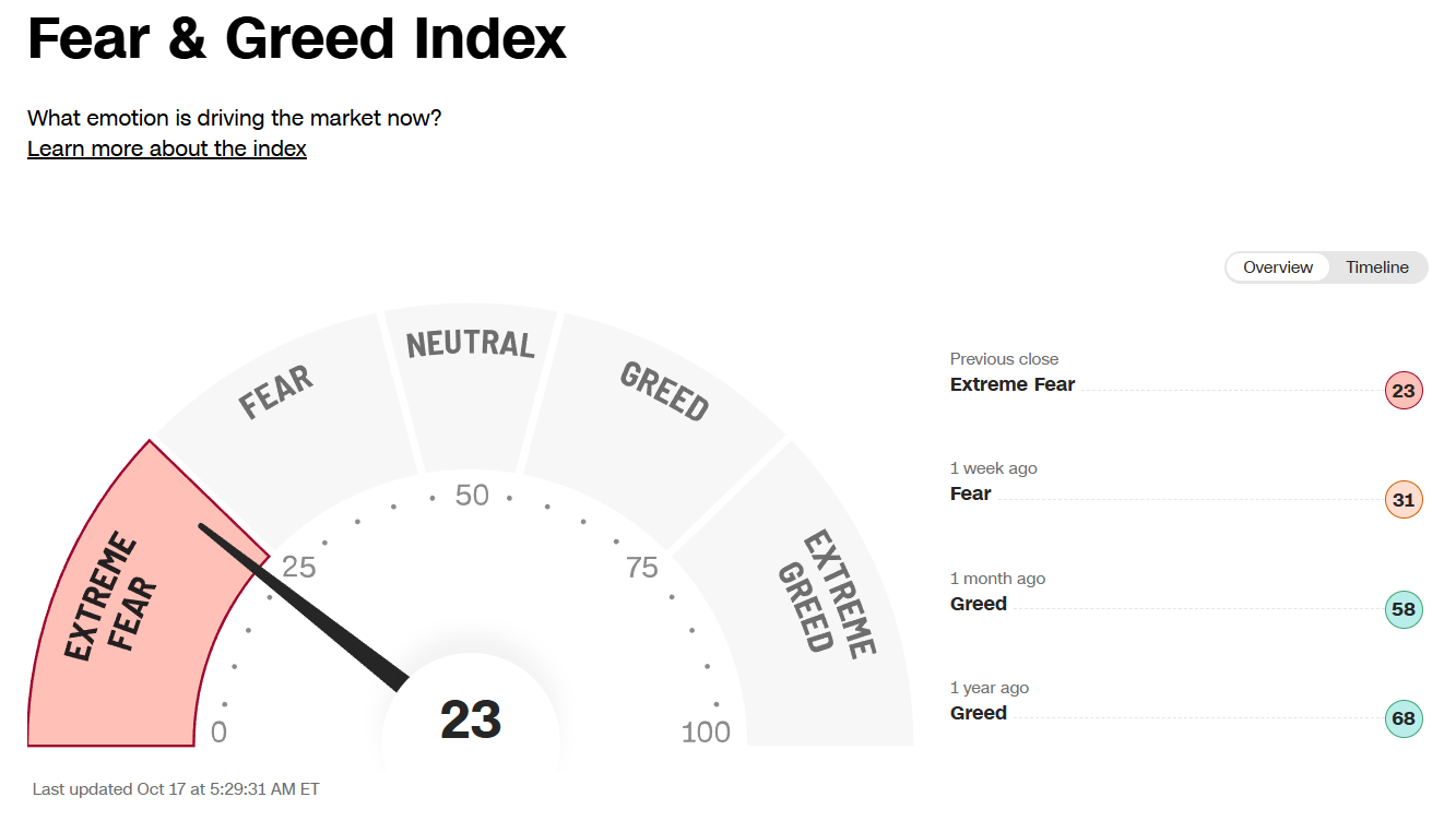 Fear & Greed Index noteras nu på 23 av 100 och indikerar därmed Extreme Fear. Detta index består som bekant inte av placerarnas “känslor” utan är en sammansättning utifrån Market momentum, stock price strength, stock price breadth, Put/Call ratio, market volatility, safe haven demand och junk bond demand. Den intresserade kan läsa mer (här). Som alltid är marknadssentiment en pusselbit av många i verktygslådan och inget man bör handla utifrån rent isolerat.