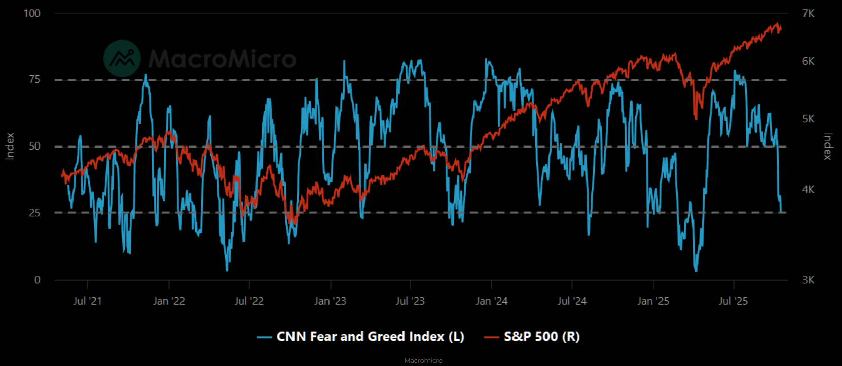 Fear & Greed index tillsammans med S&P 500 över tid.