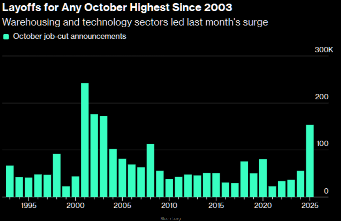 Antalet uppsägningar för en oktobermånad landade i år på den högst noteringen sedan 2003. Lager- och tekniksektorn är de sektorer som anställda drabbats hårdast. Automatisering, AI och kombination med svagare ekonomi som ligger bakom? Bevaka oddsen för räntesänkningar noga här ifrån. Det gör som vanligt enklast via CME FedWatch där marknaden just nu prisar 67% sannolikhet för -25 bps vid Fed FOMC den 10 december.