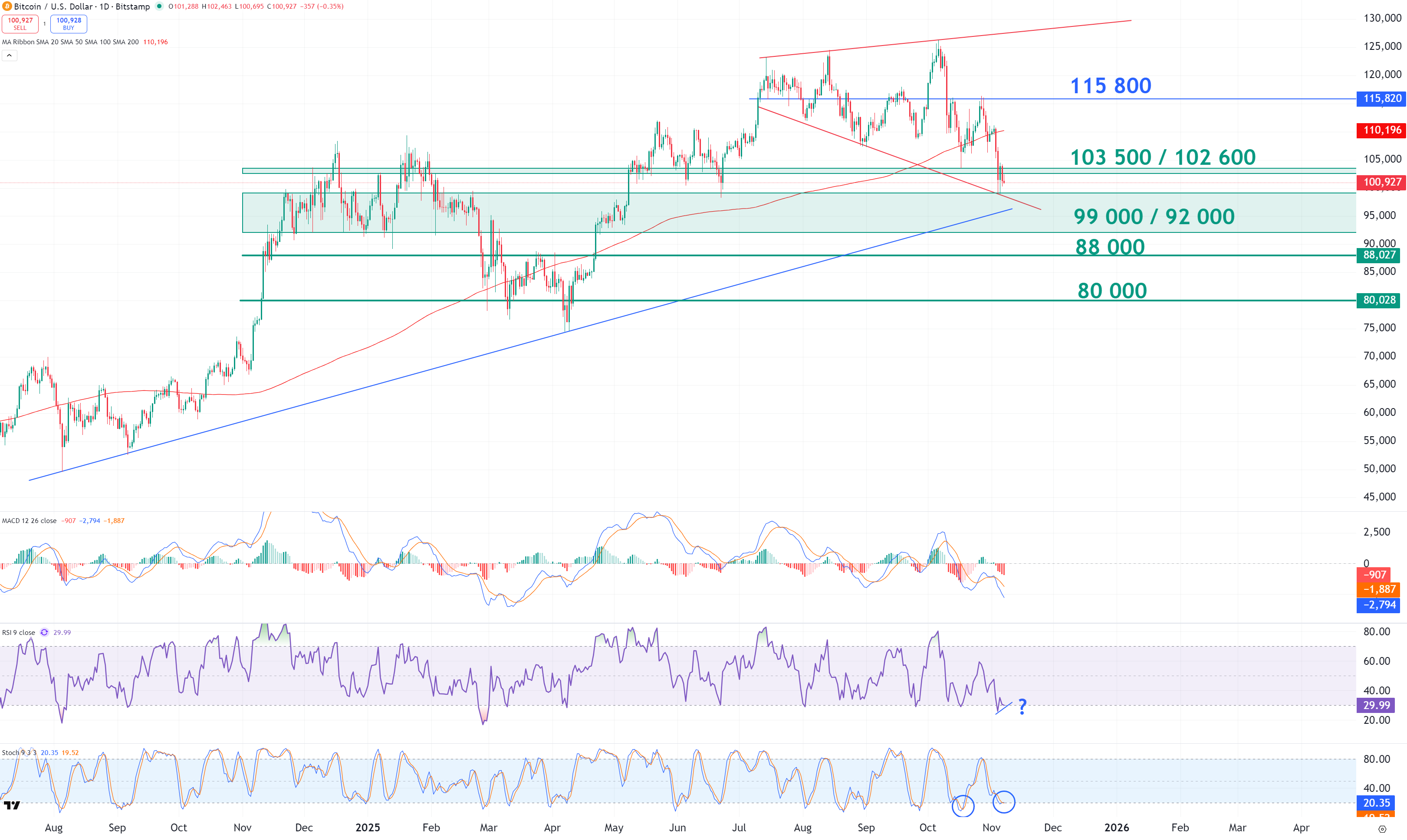 Gällande Bitcoin handlar den i en stor “megafon” strax ovanför det historiska stödområdet 99-92k USD. Trenden från augusti 2024 pekar fortsatt uppåt (blå linje) och det börjar bli upp till bevis från Bitcoin här i krokarna för att motverka en större sättning mot 88-80 k USD.