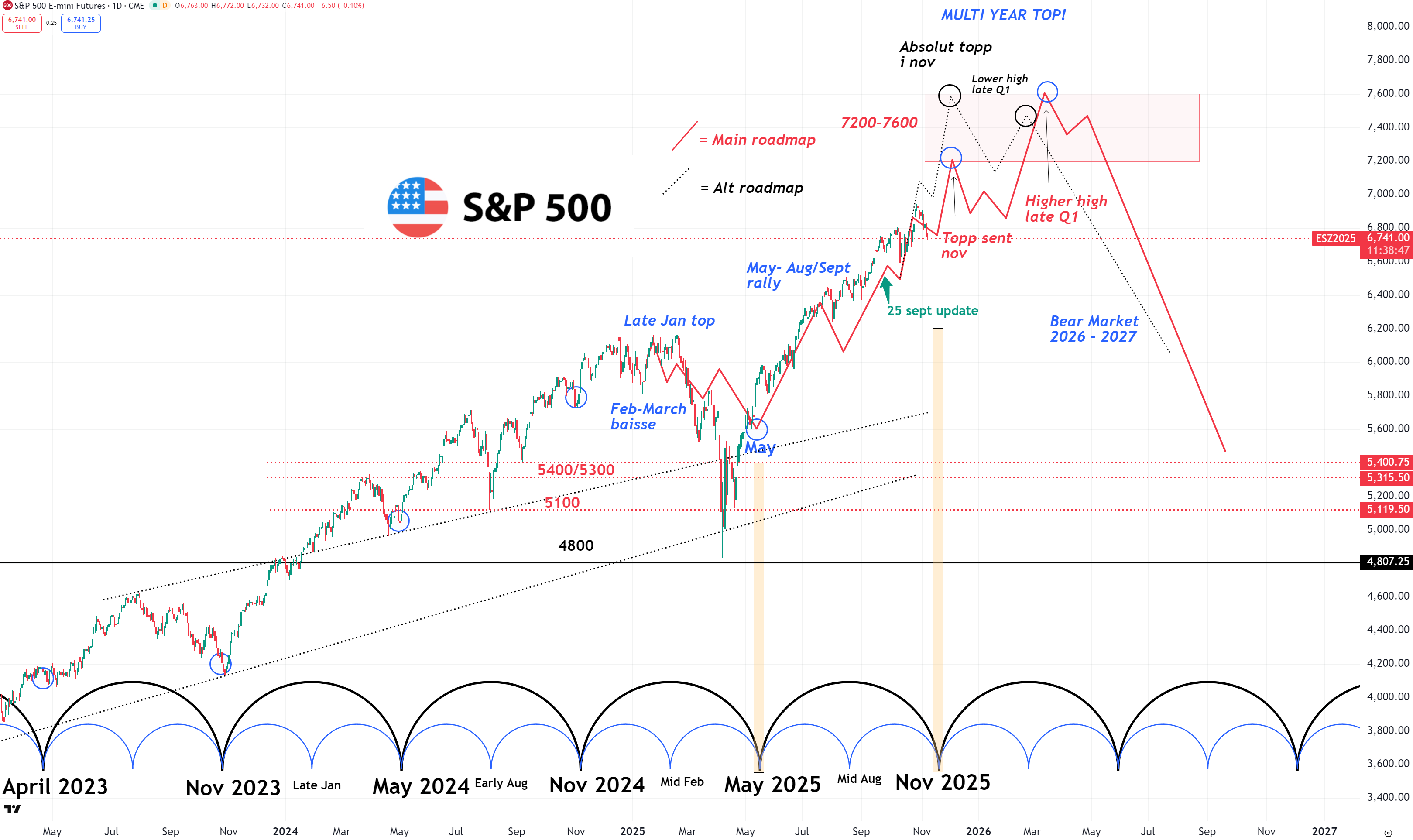 Nedan “karta” uppdaterades i krönikan från 25 september (här) och utvecklingen har sedan dess stämt hyfsat väl överens, men där det blir allt mer troligt att vi inte ser en “blow off topp” på denna sidan årsskiftet spå som “Alt roadmap” nedan indikerar. Jag favoriserar nu “Main roadmap” i rött med en topp i slutet av november/början av december och sedan ett längre toppbygge in i mars-april inför sämre tider H2 2026-H1 2027. Sen finns det mängder med historisk statistik på att även 2026 bör bli ett starkt börsår. Mm, låt mig återkomma till det i Nyårskrönikan under julhelgen!