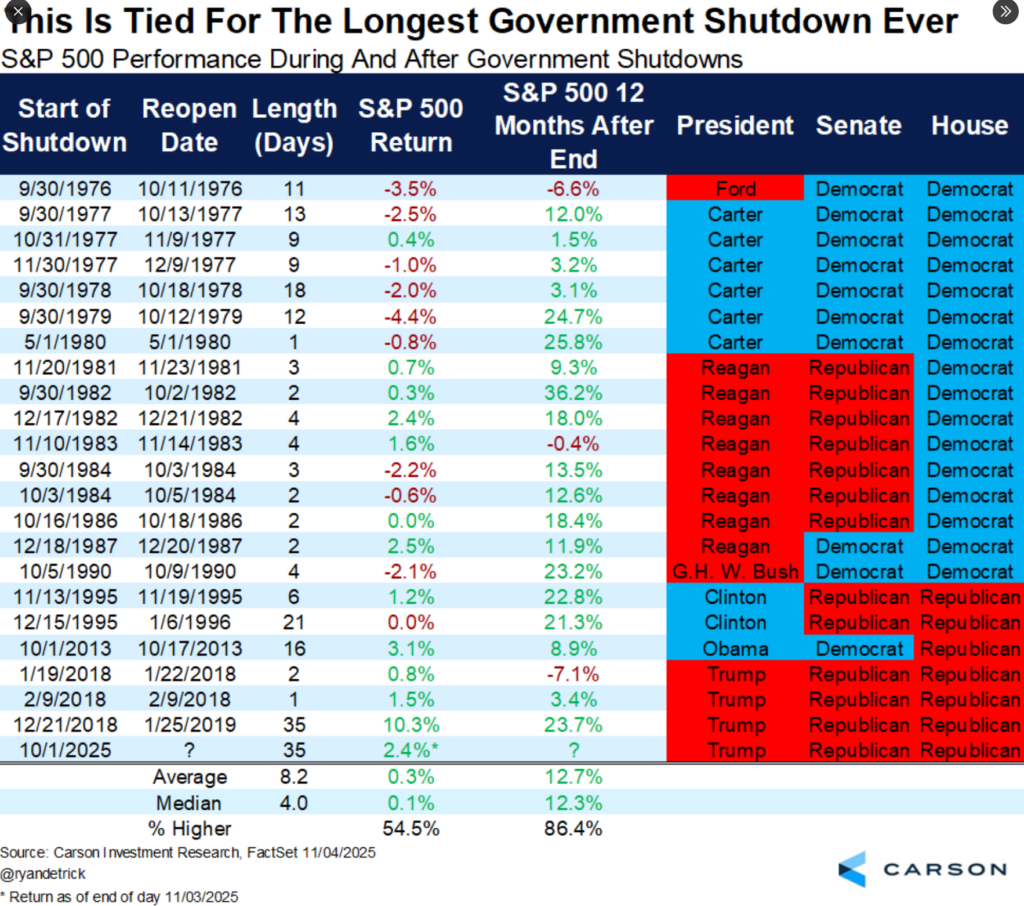 Trumps gloria har hamnat på sned den senaste tiden med kraftigt ökade layoffs inom privata sektorn, han har fått stryk i de senaste delstatsvalen (senatorer) och dessutom kommer troligtvis ett beslut från Högsta domstolen inom kort att hans tullar är olagliga. Trump kan på inget sätt tillåta att berättelsen om styrka (hos honom själv, administrationen, ekonomin osv.) börjar vackla tio månader före mellanårsvalen – han kommer vilja gå vidare snabbt. Därmed bör nedstängningen snart vara ett minne blott. Aktuella odds hos Polymarket favoriserar 15 november som det datum då nuvarande Government shotdown då kan avslutas efter 45 dagar.