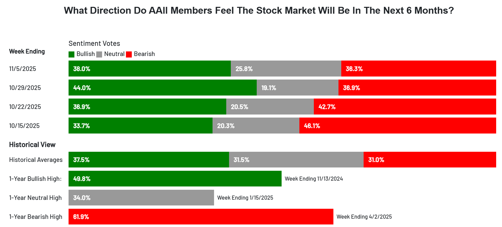 Andelen AAII Bulls har denna vecka minskat till 38 % från förra veckans 44% och där annars främst andelen med neutral hållning har ökat.