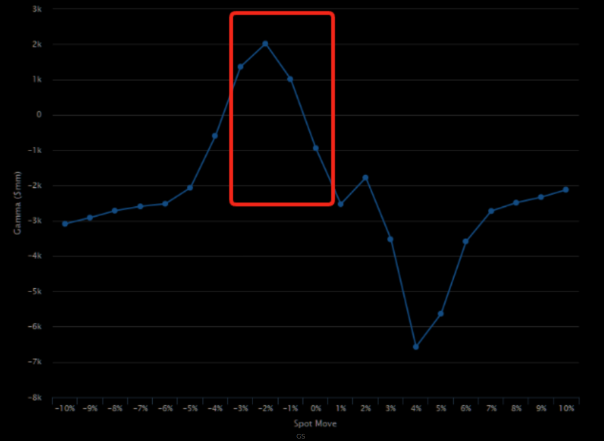 Andelen positivt delta i marknaden stiger på nedgångar om ytterligare 0-2% här ifrån enligt data från Goldman Sachs. Det gör att optionsdeskarna kommer fungera som stabilisatorer och köpa svaghet och sälja styrka för att hedgda sina optionsåtaganden. Värt att notera är också den stora andelen negativt gamma som infinner sig på uppgångar i närtid och som växer hela vägen upp mot +4% på index från dagens nivå. Det gör att det kan gå snabbt på uppsidan med om det vill sig, eftersom dealers i en sådan miljö kommer att hedga med trenden, köpa styrka och sälja svaghet.