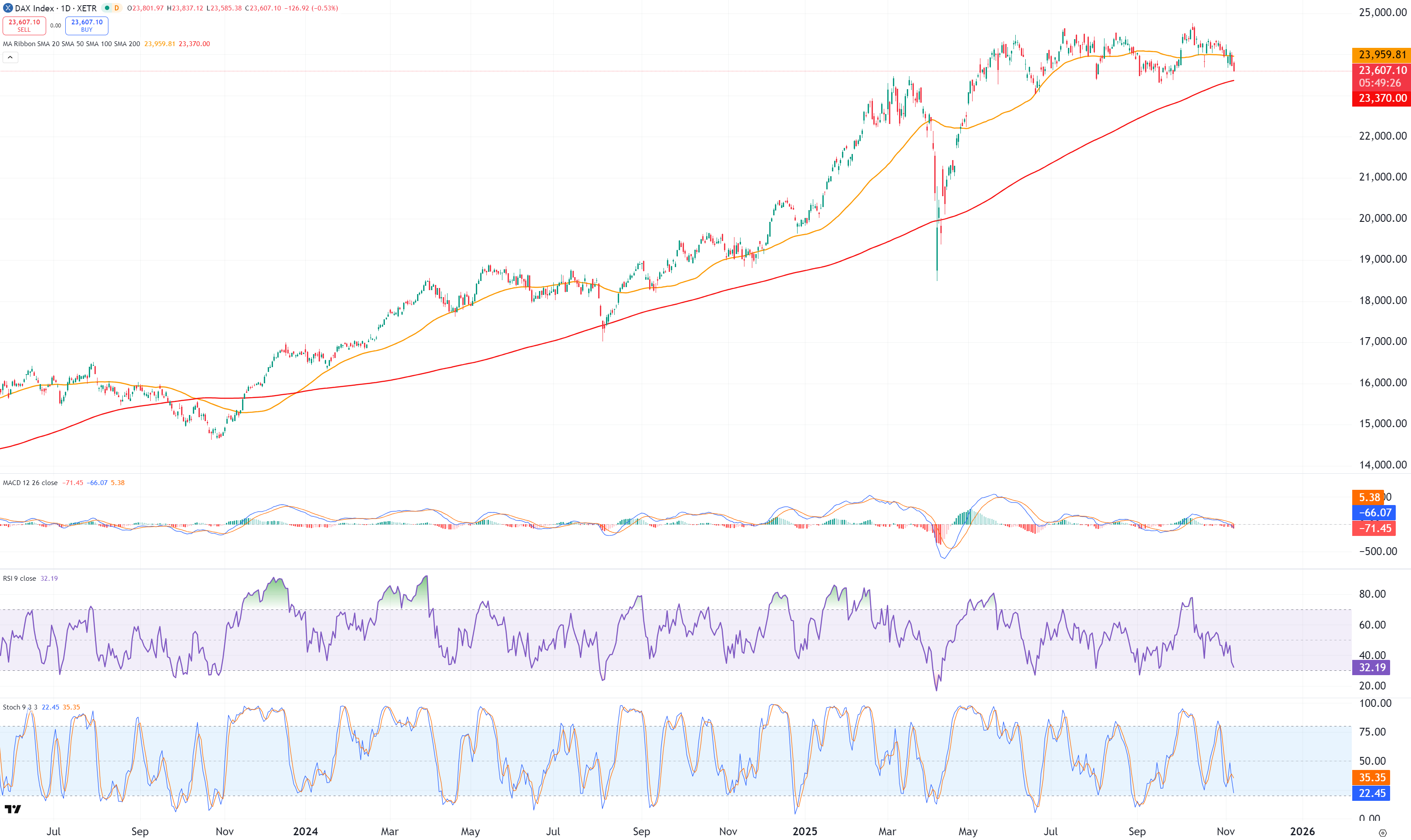 DAX handlas under MA50, men fortsatt över MA200. Inga positiva divergenser i RSI(9) ännu.
