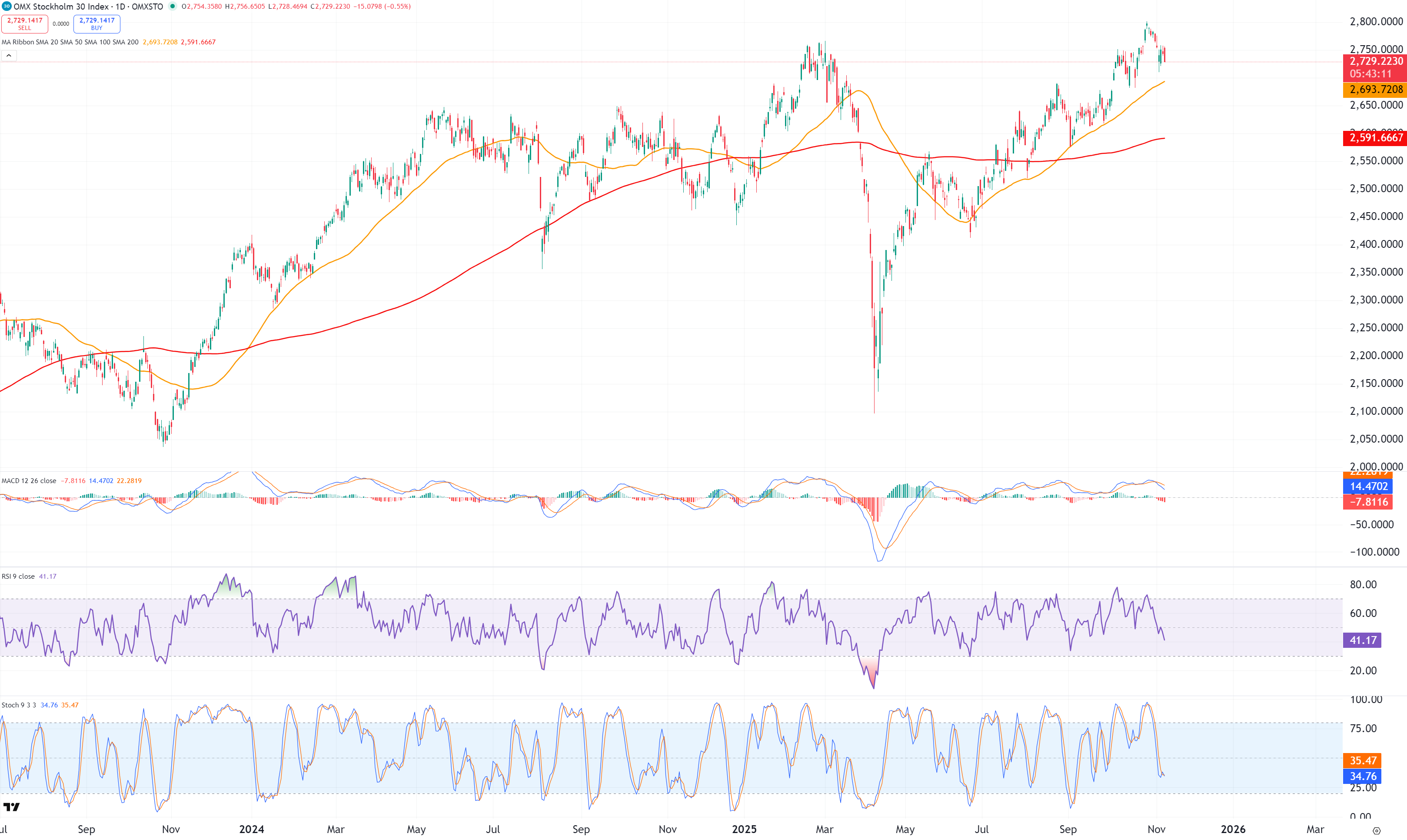 OMXS30 är betydligt starkare än DAX och handlas markant över både MA50 och MA200, dock inga positiva divergenser i RSI(9) ännu.