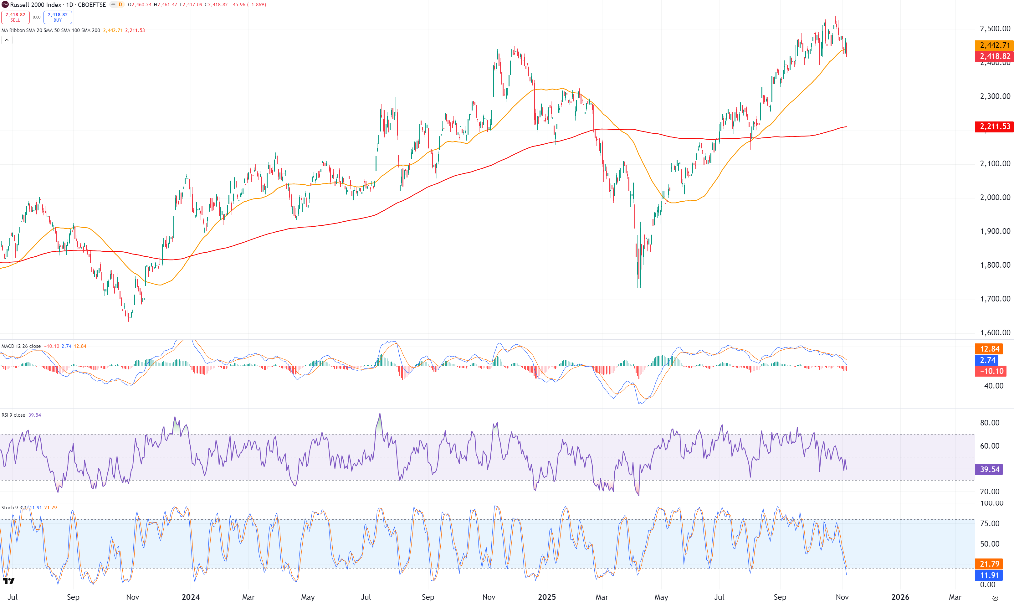 Russell 2000 stängde under MA50 igår, notera dock att stockastik är översåld här.