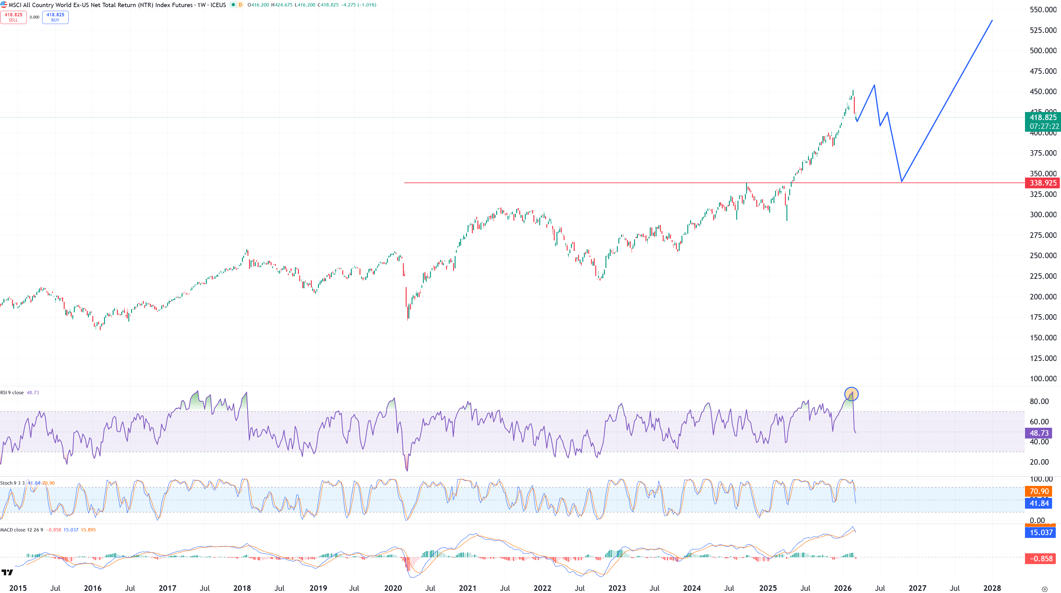 Globala börser ex USA gick liksom OMXS30 extremt starkt in i februari. Här vore det synt med ett återtest av den tidigare “breakout-nivån” senare under året. En nedgång på -19% från idag innan förnyad stark kraft in i 2028.