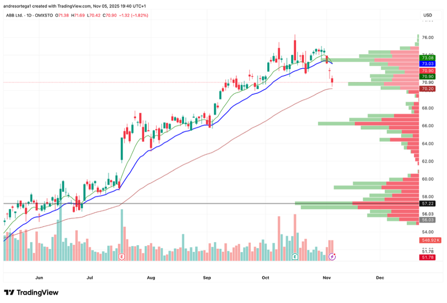 ABB Ltd. (ABB), en global ledare inom industriell automation och elektrifiering, drar nytta av vågen av återindustrialisering och effektivisering. Bolagets Robotics & Motion-division växer, och aktien har återtagit nivåer som inte setts sedan 2021. Ett utbrott över cirka 70 USD antyder en möjlig uppgång mot 83–85 USD, med stöd runt 69 USD. Företagets strategi är tydlig: automatisering har gått från att vara valfritt till att bli grundläggande.