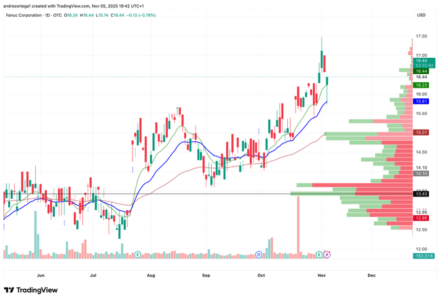FANUC Corporation (FANUY), en av de mest renodlade aktörerna inom fabriksrobotik, fortsätter att förtjäna uppmärksamhet. Aktien, som handlas kring 16,59 USD, har vänt upp från långsiktigt stöd nära 14 USD och testar nu motstånd vid 18 USD. Diagrammet visar stigande momentum och förbättrad relativ styrka, vilket tyder på att den industriella automationskatalysatorn åter tänds.