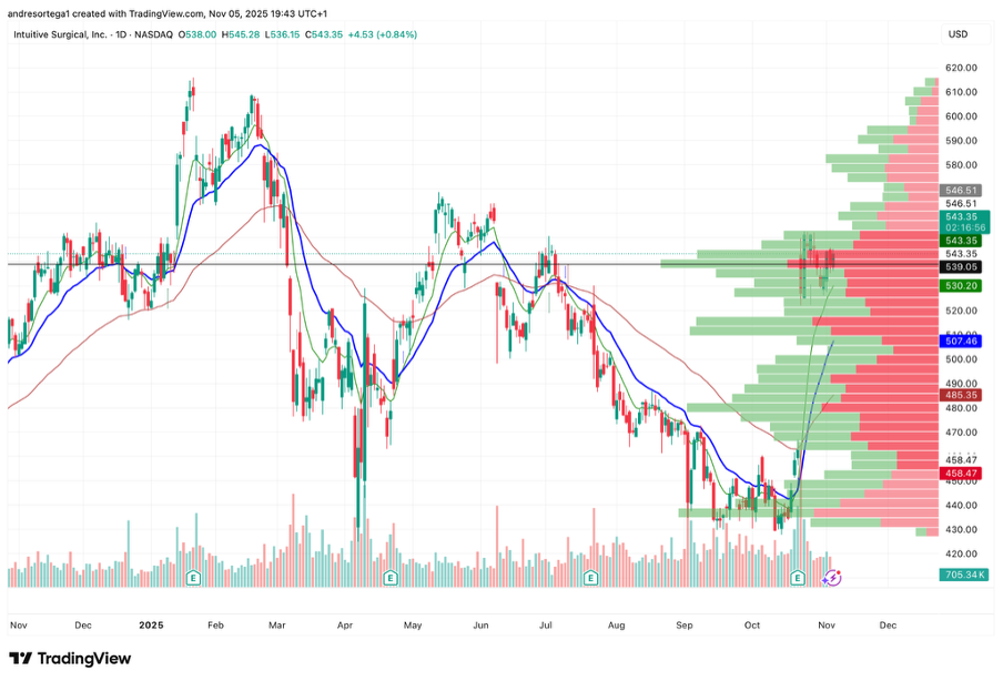Inom medicinsk robotik är Intuitive Surgical, Inc. (ISRG) fortsatt den dominerande aktören inom minimalt invasiva kirurgiska system. Även om aktien inte nått samma höjder som AI-jättarna, har den brutit över både sitt 50- och 200-dagars medelvärde och bildar nu en stigande triangel vilket antyder en potentiell rörelse mot 600–650 USD. Den återkommande serviceintäkten och skalbara affärsmodellen gör ISRG till en stabil hörnsten i robotikportföljen.