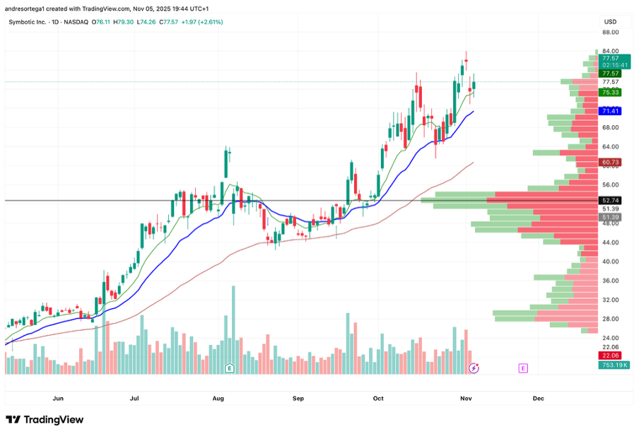 Inom lager- och logistikautomation utmärker sig Symbotic Inc. (SYM), vars AI-drivna lösningar för stora återförsäljare har fått starkt fäste. Efter flera månaders konsolidering mellan 63 och 80 USD signalerar ett utbrott över 80 USD med ökande volym en möjlig resa mot 88 USD. Även om bolaget är i ett tidigt skede är trenden tydlig.