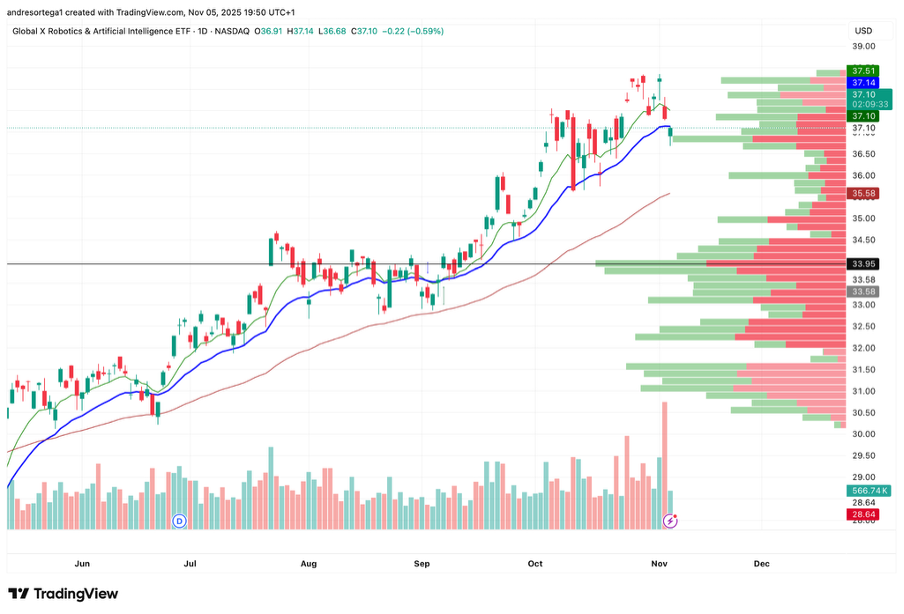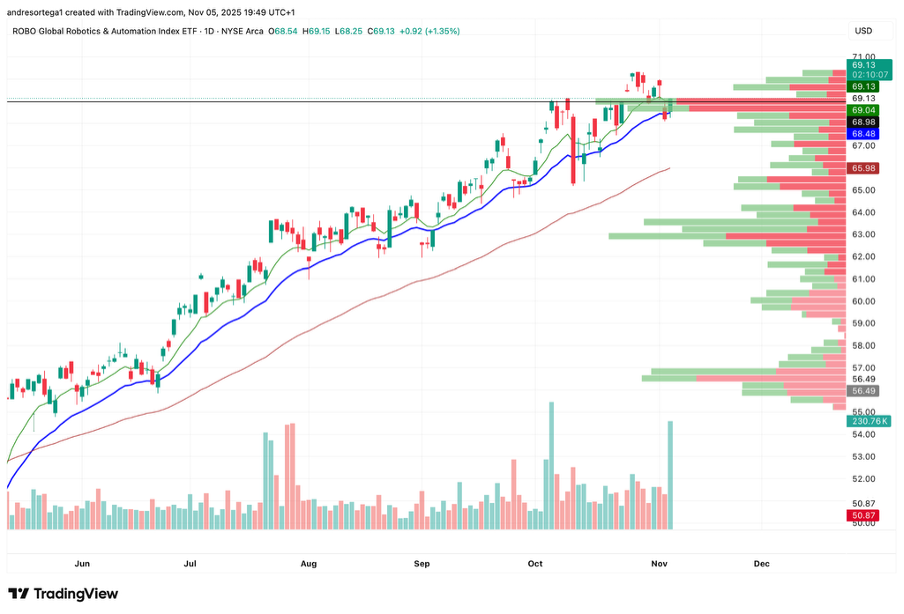 För en bredare exponering har ROBO ETF brutit över motståndet vid 60 USD och handlas nu runt 68 USD, med ett potentiellt mål på 75 USD om momentumet fortsätter. BOTZ ETF har återtagit sitt 200-dagars medelvärde, brutit 25 USD och ser ut att sikta mot 30–32 USD på medellång sikt. Dessa rörelser bekräftar att robotiksektorn har gått från marginalen till centrum.