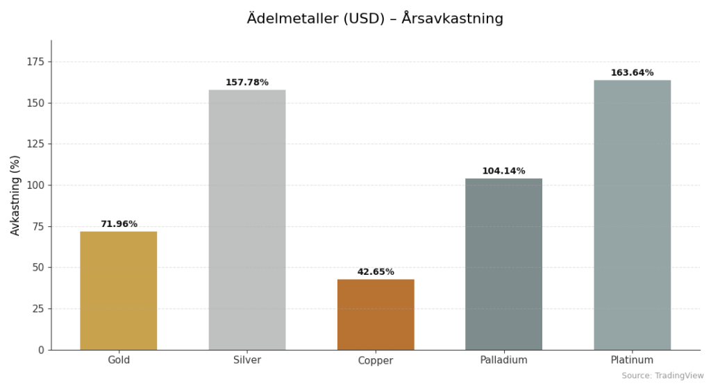 Vilket år för ädelmetaller. Stort intresse från retail, centralbanker handlar, räntesänkningar, svagare dollar, industriefterfrågan och geopolitisk oro har varit drivarna bakom denna uppgång under året. Silvret har blivit mycket populärt som värdebevarande metall efter guldets dyra pris efter den kraftiga uppgången, men även som industriell metall i elektronik. Platina och palladium fortsätter att användas flitigt i bilindustrin, även stramare leveranser och problem med transport av metallerna i Sydafrika har drivit på prisökningen.