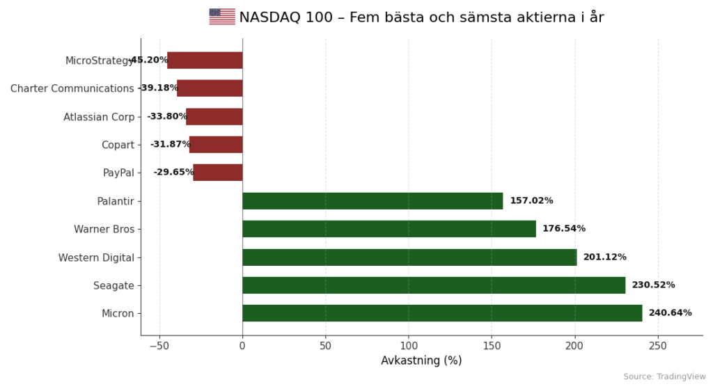 På den vinnande sidan hittar vi bolag som Micron, Warner Bros och Palantir. Efterfrågan på minnes- och lagringskretsar som används i AI-datacenter och servrar, har fått Micron att nå nya rekordnivåer. Palantir steg också på AI-hypen och kraftigt ökad efterfrågan på deras plattform (AIP). Warner Bros har stigit på grund av rykten om ett budkrig mellan Netflix och Paramount, kring ett potentiellt uppköp.