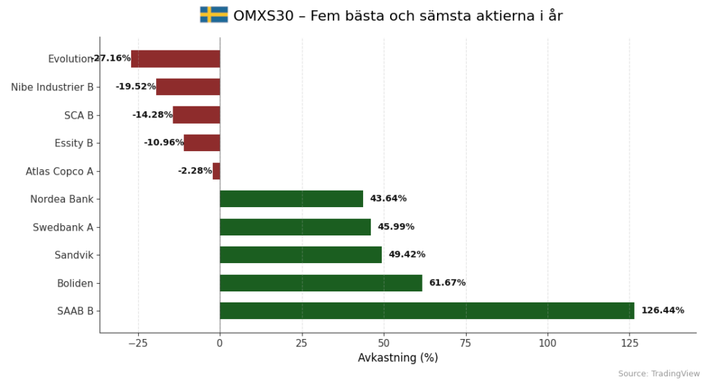 Den stora vinnaren i Sverige är SAAB. Stora investeringar i försvarsindustrin har påverkat aktiekursen mycket positivt. Boliden har gynnats av stora prisuppgångar i ädelmetaller, även Sandvik har gynnats av dessa högre priser samt stora investeringar i gruvdrift. Även bankerna har presterat mycket bra, hög lönsamhet är nyckeln som driver aktiekursen uppåt.