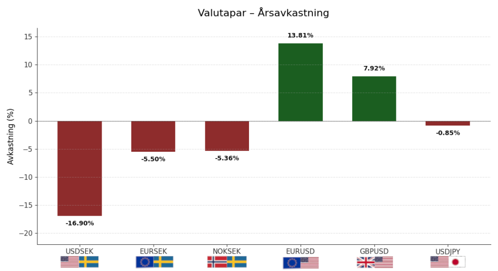 Vi börjar med att titta på några viktiga valutapar och deras årsavkastning. Som många vet påverkar valutapar och valutaväxlingar oss som investerare eller traders i hög grad. Investeringar i amerikanska dollar har under året tappat omkring -17% i värde jämfört med den svenska kronan. Den svenska kronan har även stärkts mot euron, pundet och den norska kronan. Men både euron och det brittiska pundet har samtidigt stärkts mot dollarn i år.