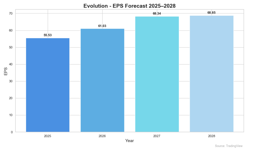Prognoserna för vinst per aktie visar en förväntad ökning med 6–7 SEK mellan 2025–2027, som sedan bromsar in under 2028. Skifte mot mer reglerade marknader, växa i nya regioner, ett större produktutbud, och en ”omstart” av varumärket, väntas vara drivaren för Evolution framöver.