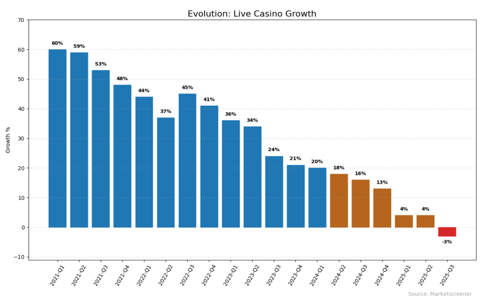 Under samma period fortsätter tillväxten i live casino-segmentet att tappa mark på grund av regleringar, ökad konkurrens och omprioriteringar. Diagram med data från Marketscreener.