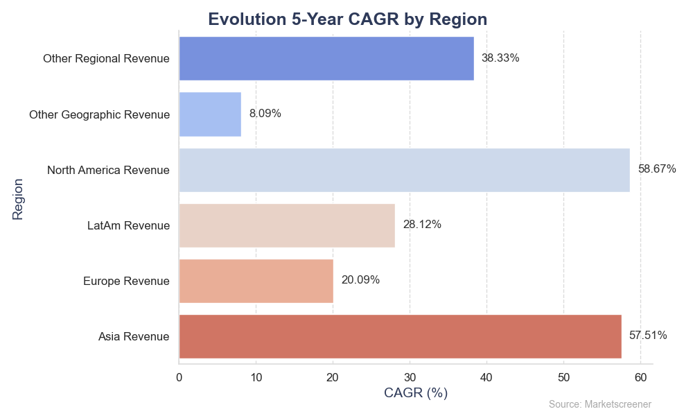 Bolaget presterar mycket starkt i flera marknader, men Asien och Nordamerika dominerar. Tillväxten i Europa är svårare eftersom det finns mycket strängare regler och skatter för spelbolag än till exempel Asien. Här nedan visas ett diagram som visar den genomsnittliga årliga tillväxttakten (CAGR) i omsättningen för varje region under de senaste 5 åren. Data från Marketscreener.