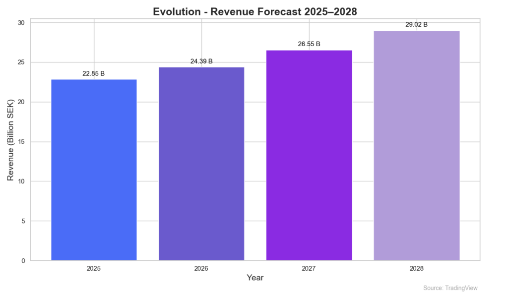 Prognoserna framåt för Evolution ser fortsatt stabila ut. Omsättningstillväxten förväntas öka med ungefär 7-8% fram tills 2028. Diagram med data från TradingView.