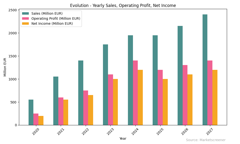 Tittar vi på helheten – försäljningen, rörelsevinsten och nettoinkomsten de senaste åren och framåt. Ser vi ett bolag som fortfarande presterar starkt och som många analytiker anser är undervärderat i dagens kurs. Diagram med data från Marketscreener.