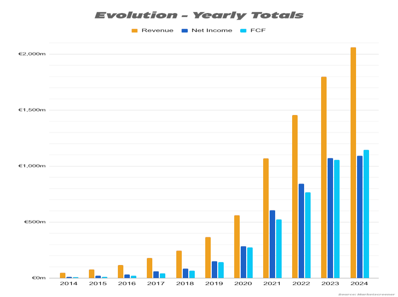 Mycket låter negativt, men det finns även många ljusglimtar fortfarande. Under 2024 visade Evolution fortsatt en mycket stark tillväxt där omsättningen växte med över 20%. God finansiell styrka, god lönsamhet och stabila marginaler är fortfarande ett faktum. Bolaget ändrar taktik och anpassar sig till nya marknader med ett nytt säkerhetstänk. Förhoppningsvis minskar de juridiska problemen.
