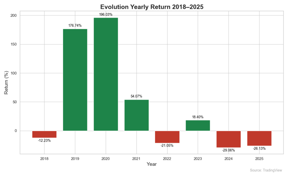 I april 2022 blockerar australiska myndigheter flera onlinecasino-sajter med anknytning till Evolution. Dessa sidor ansågs vara licenslösa och rent illegala. Fler och fler kopplingar till illegala sidor görs under 2022 och bolagets varumärke tar stor skada i medier globalt. Under samma tid sker även en stagnation inom delar av verksamheten, tillväxten börjar att bromsa in. Tabellen nedan visar den årliga utvecklingen sedan 2018. Data från TradingView.