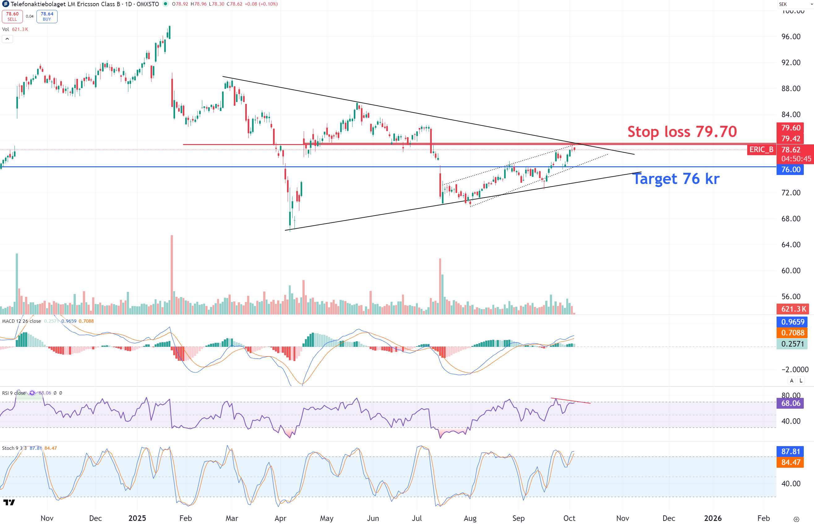 Vi väljer således att gå kort Ericsson här med en tajt stop loss om på 79,70 kr (-1,4 %), vilket är strax över stödområdet från i somras innan rapport samt skulle innebära break-out ur den stora vimpelformationen som aktien handlats i sedan i februari. På nedsidan ser vi 76,00 kr (+3,7 %) som målområde senare i oktober.