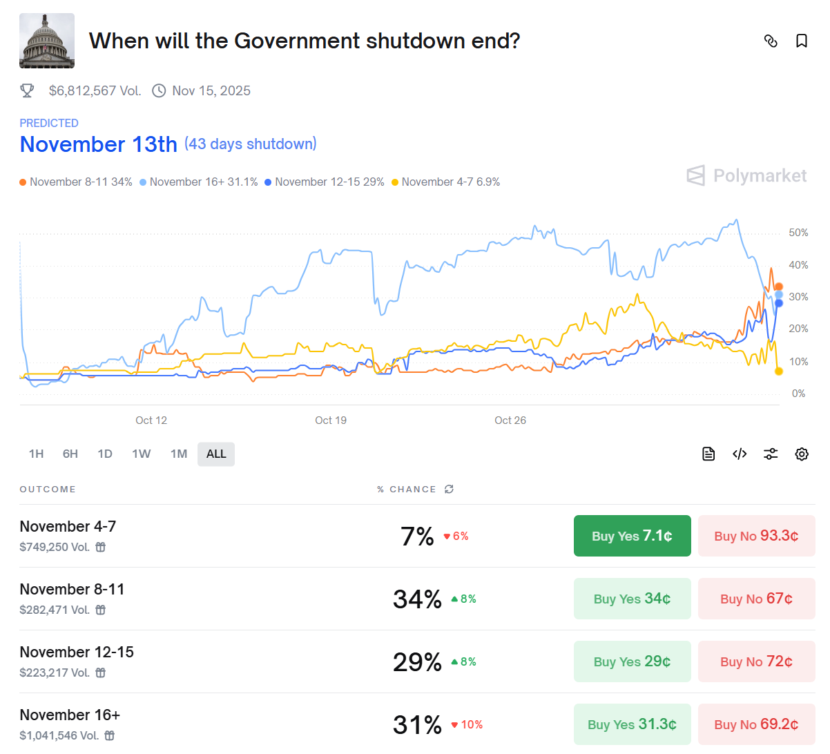 Detta bör dock snart komma att förändras och ser vi till Polymarket är den sammanlagda sannolikheten att nedstängningen avslutas den 13 november. Det skulle medföra att TGA-pengar flödar tillbaka in i systemet från mitten av november och på nytt främja ökat risksentiment på nytt.