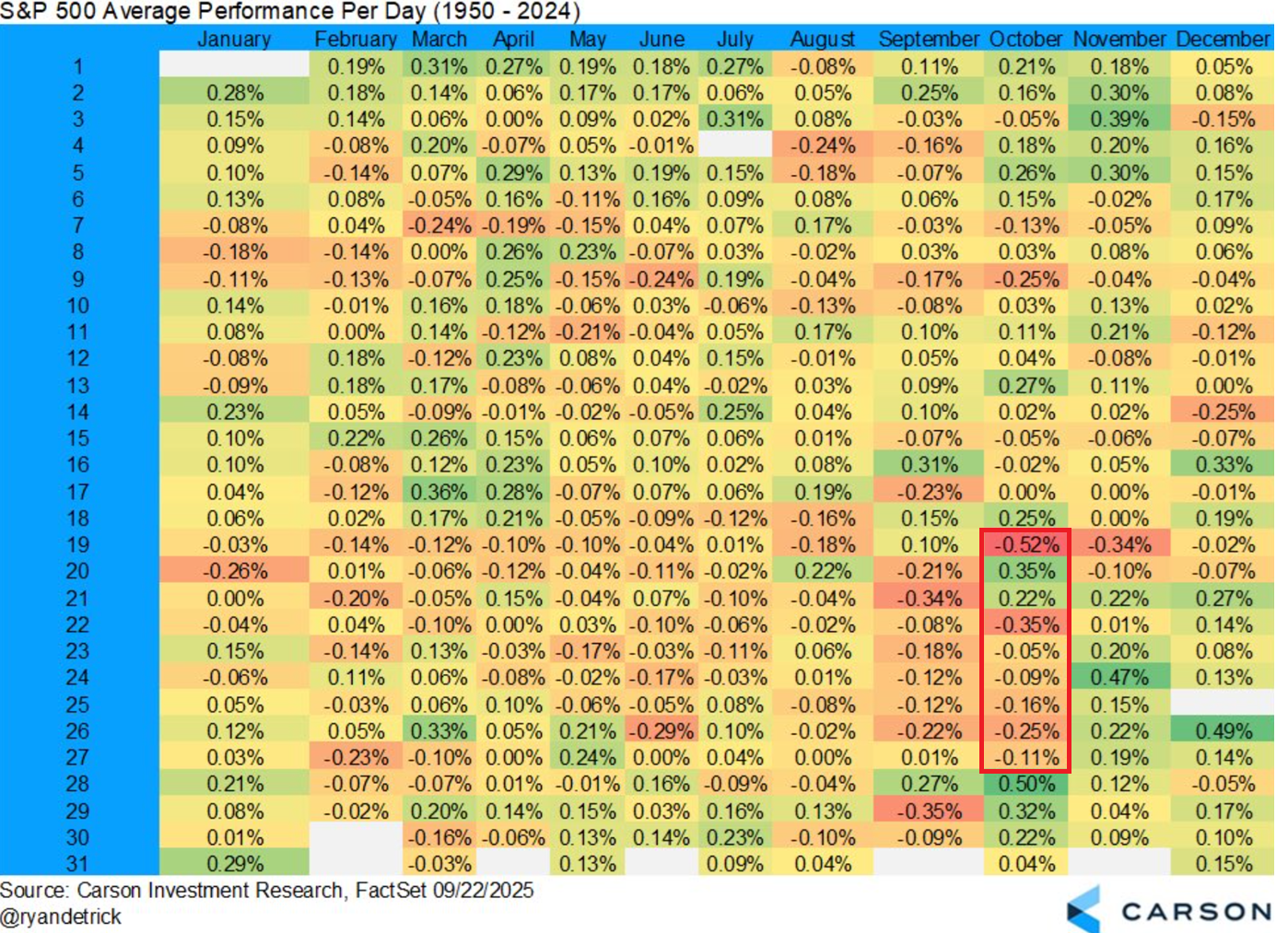 De senaste två veckorna har bjudit på en volatil sidlänges handel både i Europa och i USA och faktum är att det historiskt sedan 1950-talet inte är ovanligt med ökad volatilitet och svag indexutveckling för perioden 19-27 oktober. Däremot går vi ur denna något tristare period från och med måndag nästa vecka och följande nio handelsdagar har i snitt bjudit på stabila uppgångar och som också markerar starten på en positiv börsutveckling kommande halvår historiskt!